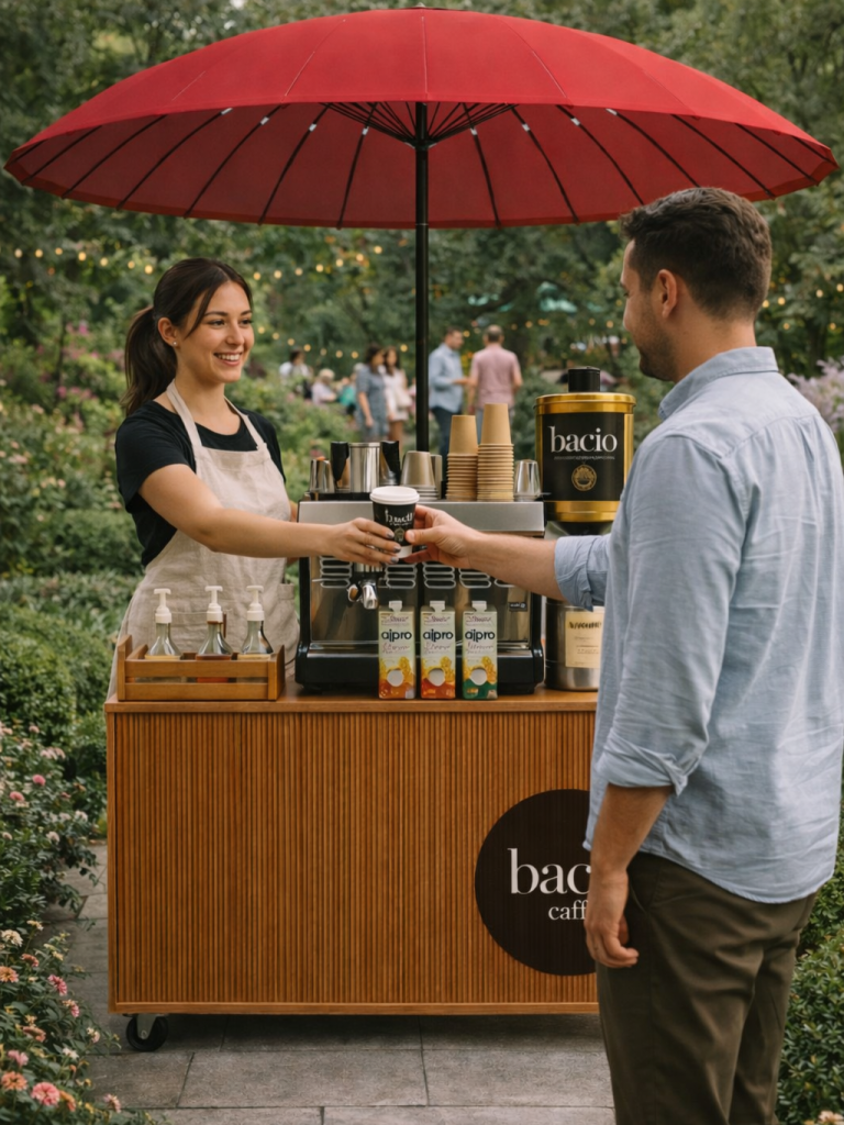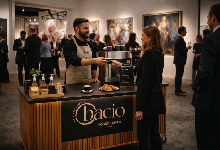 Comptoir café mobile Bacio Caffè pour événements d'entreprise et salons professionnels.